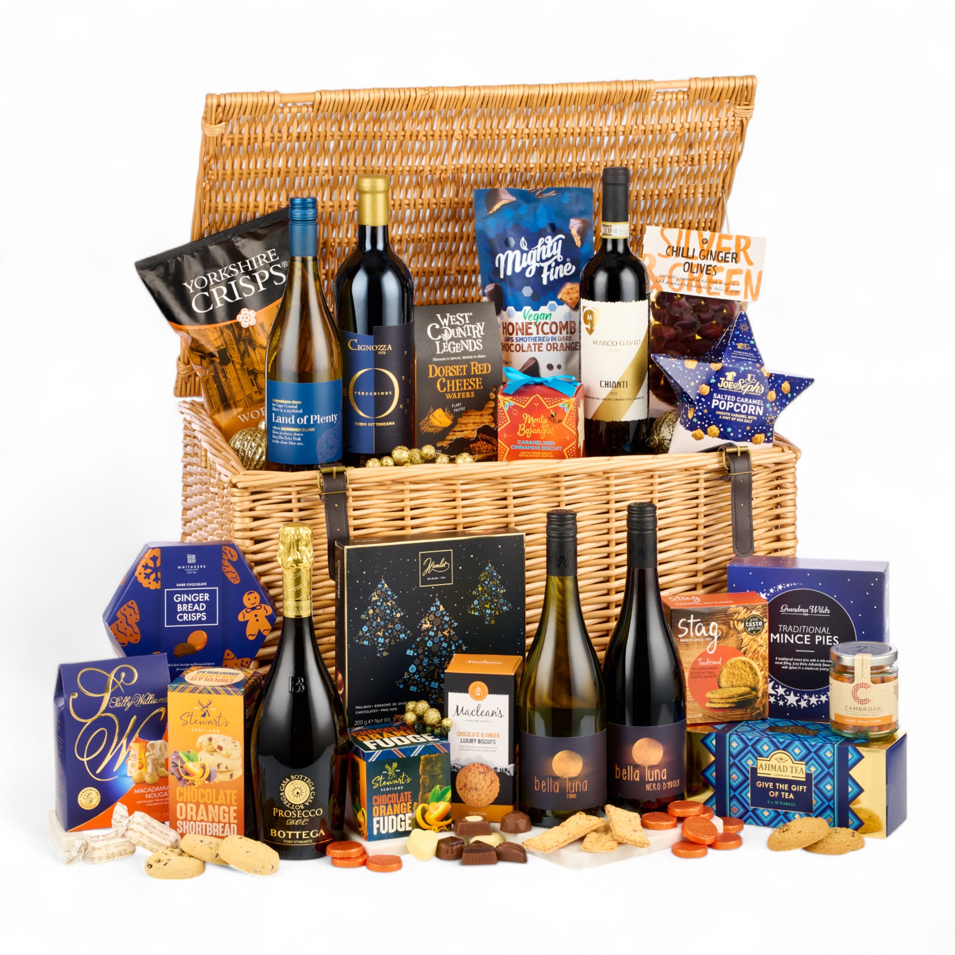 Bella Luna Nero D'Avola 75cl Bella Luna Fiano 75cl Land of Plenty Sauvignon Blanc 75cl Marco Gavio Chianti DOCG 75cl Cignozza Peregrinus Toscana 75cl Casa Bottega Prosecco DOC 75cl Yorkshire Crisps Worchester Sauce 150g Maclean's Chocolate & Ginger Luxury Biscuits 150g Mighty Fine Vegan Dark Chocolate Orange Honeycomb 90g Sally Williams Macadamia Nougat 150g Hamlet Pralines 200g Whitakers Gingerbread Honeycomb Crisps 165g Stewarts Signature Chocolate Orange Fudge 100g West Country Legends Dorset Red Cheese Wafers 80g Grandma Wild's Traditonal Mince Pies 4's Stag Traditional Stornoway Cocktail Oatcakes 125g Ahmad tea Give the Gift of Tea 30 Bags Cambrook Giant Chilli Corn 52g Stewarts Chocolate Orange Shortbread 160g Silver & Green Chili Ginger Olives 220g Joe& Seph's Salted Caramel Mini Star 32g Monty Bojangles Caramelised Cinnamon Biscuit Truffles 100g Packed in Wicker BasketDelivery & Returns